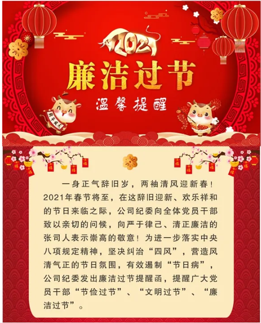 “一身正氣辭舊歲,兩袖清風迎新春。2021年春節將至,公司紀委提醒全體黨員干部節儉過節、文明過節、廉潔過節。”