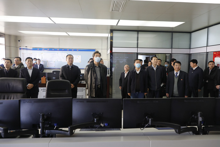 在調度指揮中心,李萬疆等各級領導詳細查看了工作臺賬和圖紙資料,深入了解了井下工作面煤層分布、巷道布置、安全監測監控、生產系統設備運行參數等情況。公司領導現場匯報了融合通信、智慧通風、地質可視化及礦井“一張圖”協同管理系統的運行情況。