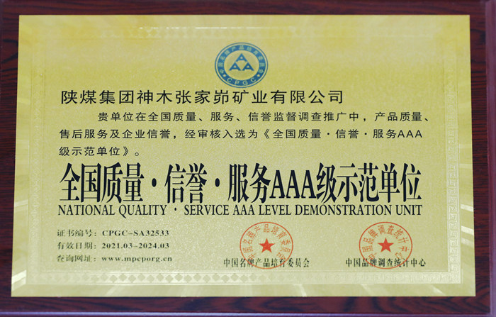近日,公司“張家峁牌”煤炭產品被中國名牌產品培育委員會和中國品牌調查統計中心認定為“中國著名品牌”,公司成功入選“全國質量·信譽·服務AAA級示范單位”。