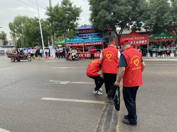 6月7日,輔運隊“藍領家園”服務站的青年志愿者們便早早來到考場外搭起了服務臺、遮陽棚,為候考生和陪考家長提供休息場所,并準備了飲用水和應急文具等愛心物品,供考生和家長免費取用。同時,為了保持考點外秩序井然,志愿者主動協助交警同志搭設警戒線,對考點周邊的交通秩序進行疏導和維護,除此之外,志愿者們還對考場周邊的垃圾、煙頭進行了集中清理,保證了考場周圍的環境干凈整潔,為考生們創造了一個安靜的考試氛圍。