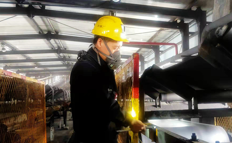安全確認完成后,檢修工作正式開始,根據分工安排,他們有的拆卸重錘上方護欄和蓋板;有的在改向滾筒前方下皮帶打夾板并固定好;有的在重錘上方合適位置兩側各掛一個五頓吊鏈,并用鋼絲繩口套牢下方重錘滾筒并起吊到合適位置,將吊鏈小鏈固定綁好,防止滑鏈;然后在上皮帶合適位置再打副皮帶夾板并固定好;在重錘室利用自制鋼架支撐重錘,兩側架設腳手架,確認支撐牢固;剔除滾筒磨損包膠、打磨滾筒、刷膠、包膠,壓實......通過4個小時有條不紊地工作,一道道工序有序進行,最終安全、高效完成包膠工作。