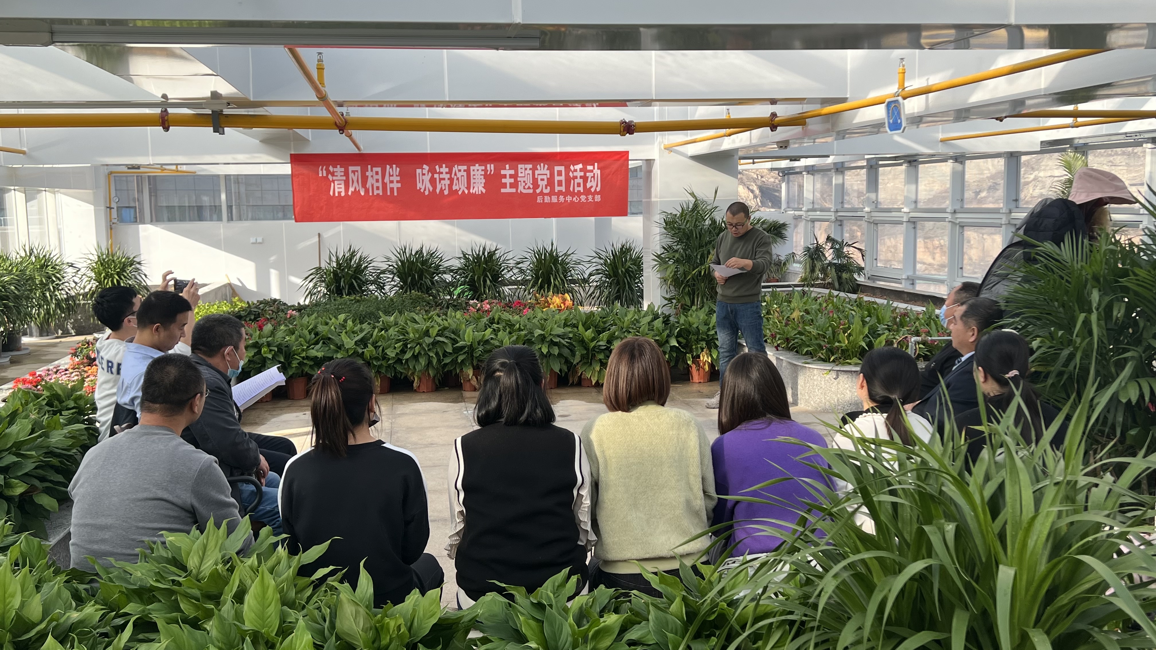 綠茵盎然的環境滋養人,經典詩詞中的傳統文化浸潤人。為深入推進支部清廉文化建設,在經典詩詞中汲取清廉養分,營造濃厚的“廉榮貪恥,潔身自好”的工作氛圍,根據后勤服務中心黨支部主題黨日全年工作安排,11月25日下午,后勤服務中心黨支部十余名黨員齊聚陽光房內,開展了一場別開生面的以“清風相伴·詠詩頌廉”為主題的詩文誦讀黨日活動。